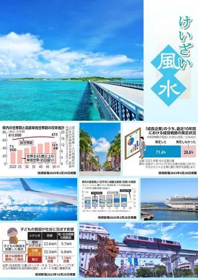 琉球新報社ご協力のもと、沖縄銀行の各支店長や弊社研究員が執筆し、「けいざい風水」と題したコラムを毎週日曜日の経済面に 掲載していただいています。日頃の営業活動を通して、様々な視点や切り口で県内の経済や観光産業、地域振興、伝統行事など各地域の実情を取り上げています。